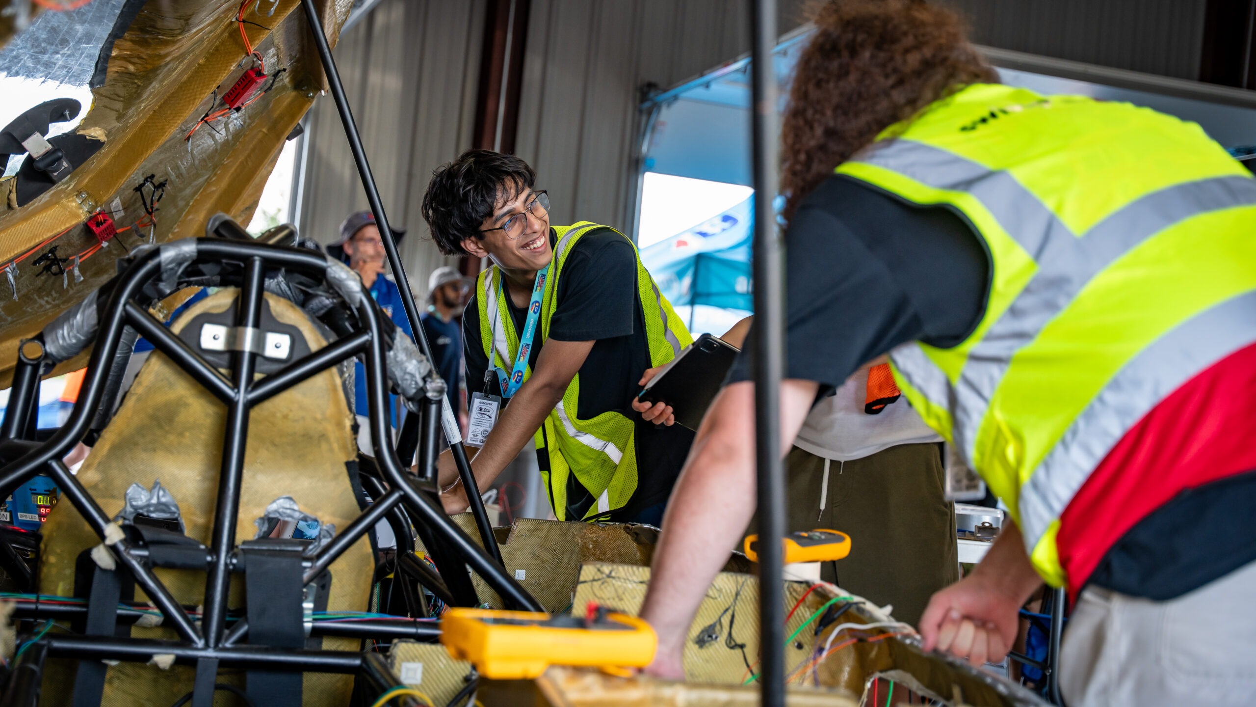 - Two people in yellow safety vests work together on a partially assembled Midnight Sun vehicle inside a workshop, surrounded by mechanical components and tools. One person smiles while holding a tablet.