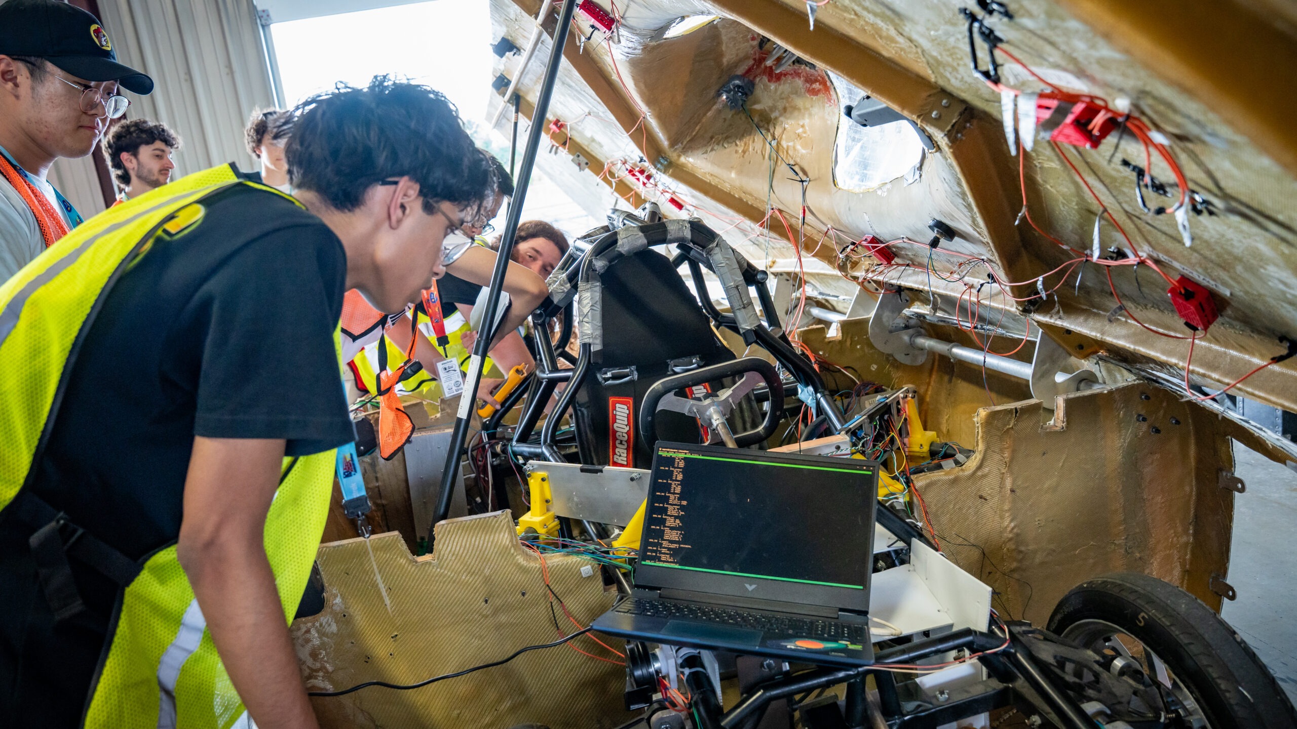 - A group of people wearing safety vests work on the exposed interior of a vehicle, with wires and components visible. A laptop displaying data is connected to the Electrek Formula Sun Grand Prix entry from UW Midnight Sun.