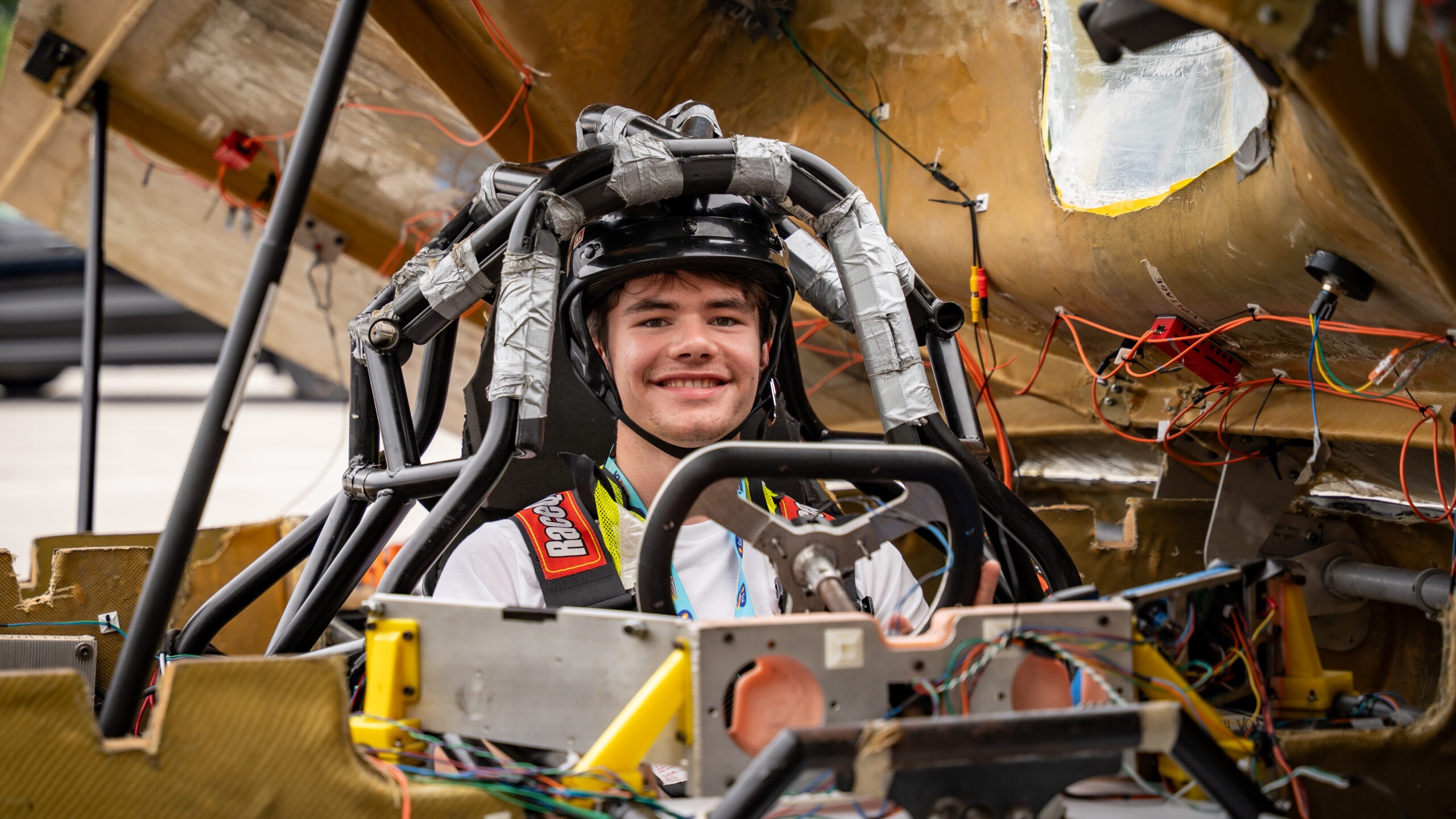 - A smiling young man wearing a helmet and racing harness sits in the cockpit of a partially assembled Midnight Sun race car, surrounded by exposed wires and mechanical components.