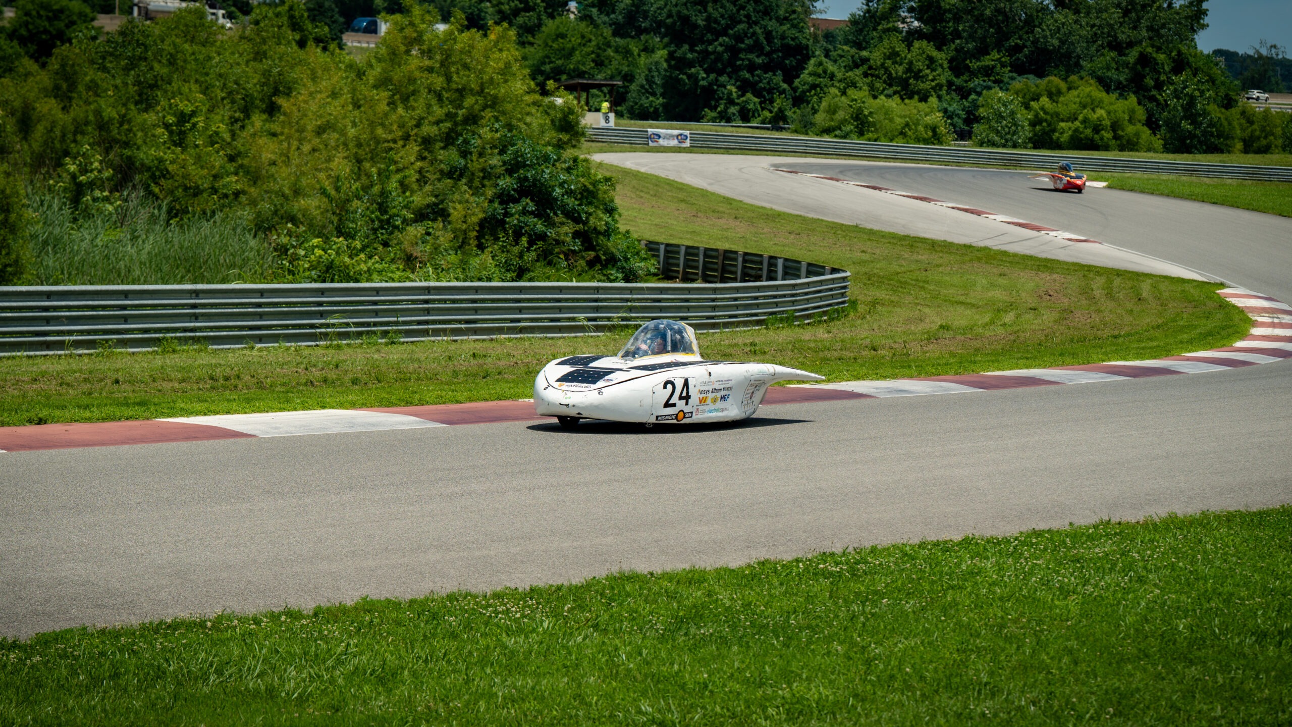 - A white solar-powered race car numbered 24 from UW’s Midnight Sun team speeds along a curving racetrack at the Electrek Formula Sun Grand Prix, surrounded by grass, trees, metal barriers, and another car in the background.